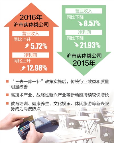近年来,沪市利润贡献公司已经以服务业为主。2016年,沪市包括房地产、金融、文化、信息技术、饮食、零售百货等在内的服务业公司,合计实现净利润约1.7万亿,占总体比例已近八成,贡献极大。不少企业实现快速增长。例如,零售百货企业永辉超市实现营业总收入492.32亿元,同比增长16.82%,实现净利润12.42亿元,同比增长105.18%。