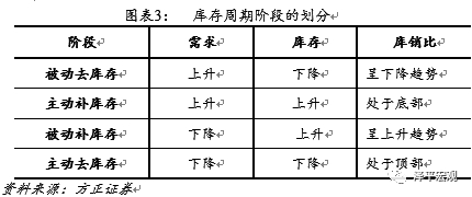 通常来讲,库存周期被划分为被动去库存,主动补库存,被动补库存和主动去库存四个阶段。其中,被动去库存阶段,呈现的是经济复苏,需求开始好转,而企业由于在上一周期中的库存挤压,仍然处于去库存之中,库销比下降;随着需求持续好转,企业开始补库存,库销比维持底位,经济进入主动补库存阶段;当需求拐点出现后,企业仍在补库存,库销比上升,进入被动补库存阶段;伴随需求的持续回落,企业主动减少库存,库销比维持高位,进入主动去库存阶段。
