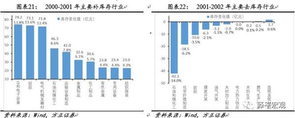 中国的五轮库存呈现出不同的特征。其中,第一轮库存周期始于2000年5月。本轮库存周期性扩张的根本原因是1998年后,以纺织和煤炭行业为代表的国有企业改革,促使供给侧产能的出清;直接原因是中国外贸需求在2001年正式加入WTO后快速增加。本轮周期补库存过程持续13个月,至2001年6月达到库存峰值后走低。
