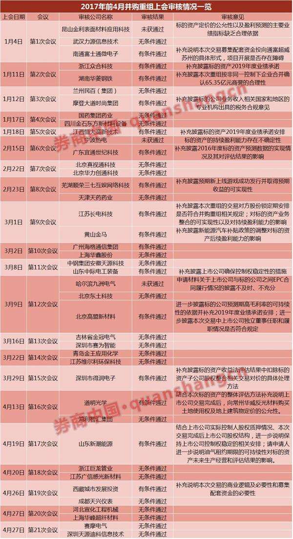去年同期,共有95家上市公司的并购重组上会,无条件通过39家,有条件通过52家,被否4家,通过率为95.8%。