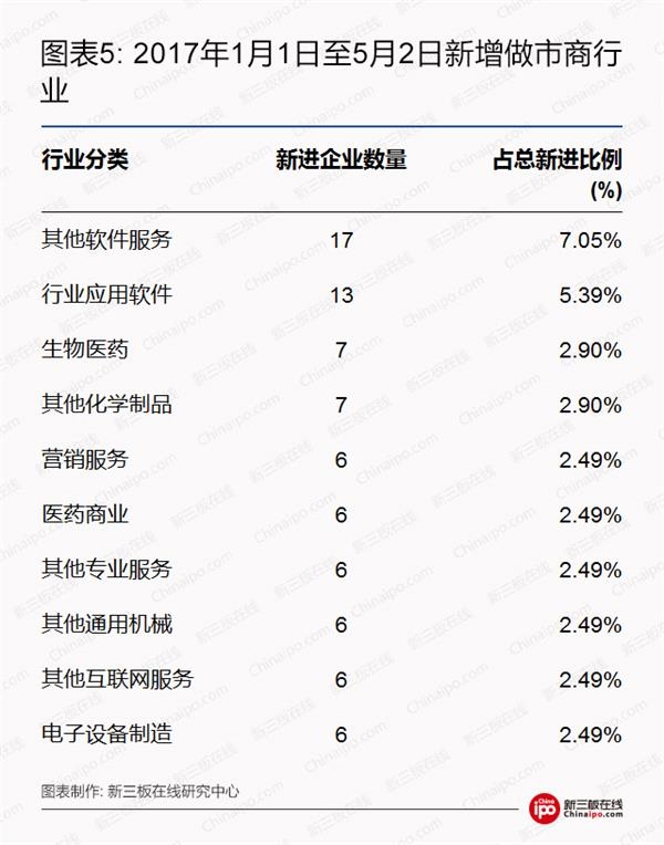 根据新三板在线的统计,2017年初至5月2日,软件、生物医药等行业新增做市商的企业数量排名靠前。此外,软件和生物医药企业的2016年度营收平均增长率达到32.02%。