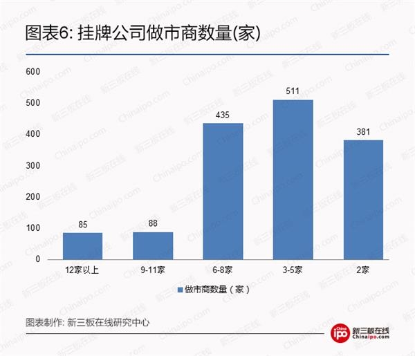 表中拥有3至8家做市商的挂牌企业数量最多,为946家。其次是拥有2家做市商的挂牌企业,这主要是因为2家做市商是“做市转让”的最低门槛,所以大多数刚刚“入门”的企业都以2家做市商作为起步标准。而拥有9家以上做市商的挂牌公司仅有173家,较之8家以下做市商的数量出现大幅下降。