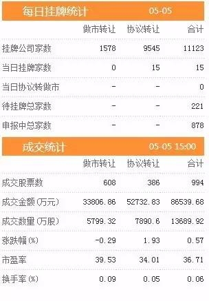5日共有994只股票发生交易,成交金额8.65亿元,做市转让成交3.38亿元,协议转让成交5.27亿元,成交数量13689.92万股。
