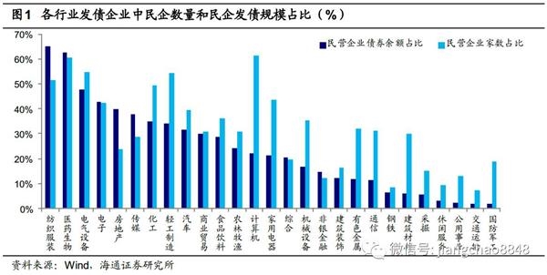 下游充分竞争行业,民企占比较高。我们统计了各行业发债企业中民营企业的占比,发现计算机、医药生物、电气设备、轻工制造和纺织服装行业均超过50%,这些行业多是下游竞争较为充分的行业;相反,中上游行业诸如钢铁、采掘等行业多以大型国有企业为主导,发债企业中民营企业占比不足20%。
