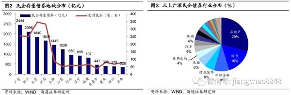 1. 充分竞争的中下游行业。我们统计了各行业发债企业中民营企业的占比,计算机、医药生物、电气设备、轻工制造和纺织服装行业均超过50%,多是充分竞争的中下游行业;而上游行业诸如钢铁、煤炭则是以大型国有企业为主导,发债企业中民营企业占比较少。2.北上广深和江浙、山东。北上广深、江浙、山东是民企债券存量较多的几个地区。北上广深民企债券主要以地产债为主;江浙地区则集中在商业贸易和地产行业,化工、建筑装饰、钢铁、纺织等行业的民企债券也较多;山东地区发债民企主要集中在化工、食品饮料、综合、纺织服装行业,规模占比合计达到77%。
