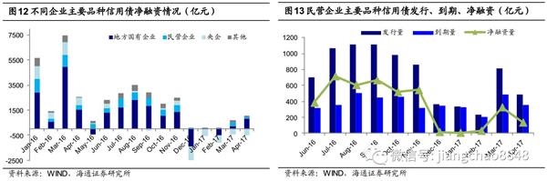 3月民营企业债券净融资率先回暖。17年3月信用债净融资小幅转正,民营企业是主要推动方,当月债券发行额超过810亿元,净融资接近300亿元;地方国有企业向来是信用债融资主力,但3月份净融资额只有131亿元,远低于民企;央企信用债净融资额还是为负,净融出196亿。4月以来信用债发行量略有回升,主要是地方国企和民营企业在发债,央企净融资还是为负。
