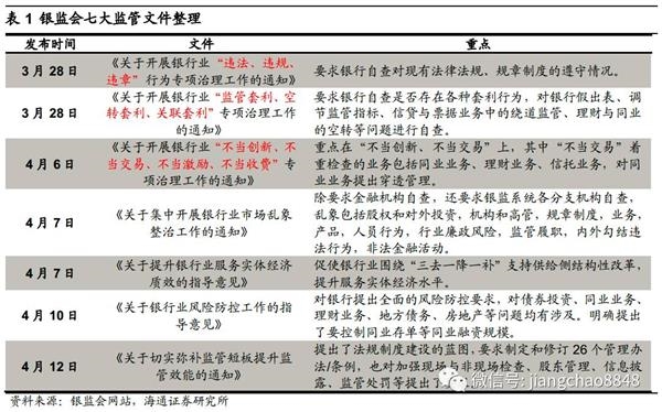 银监会出台七大文件,规范同业业务。3月底以来银监会密集发布7大文件,从专项治理“三违法”、“三套利”、“四不当”的银监办发45、46和53号文,到强调防范风险、治理市场乱象、提升银行业服务质效、弥补监管短板的指导性文件(银监发4、5、6、7号文),都指向银行的同业链条及各种套利行为。