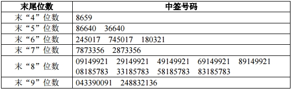 凡参与本次网上定价发行的投资者持有的申购配号尾数与上述号码相同的,则为中签号码。中签号码共有34440个,每个中签号码只能认购500股贵阳新天药业股份有限公司A股股票。
