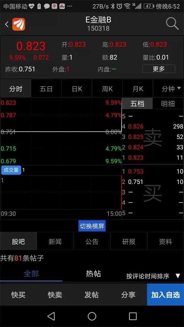 E金融B在下午3点00分以0.823的价格成交了1手,就是这1手,将E金融B一把打到接近涨停的位置。