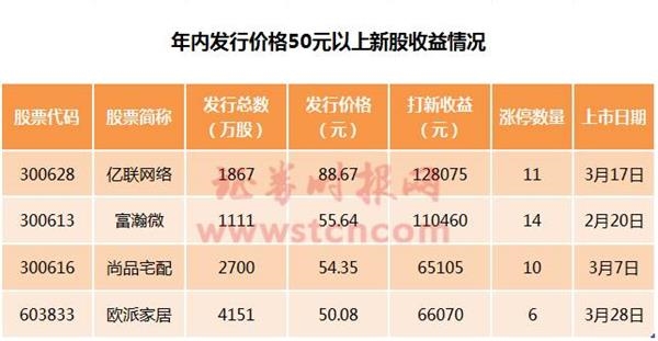 今年以来,发行价格超过50元的新股已有4只,分别是发行价格高达88.67元的亿联网络、55.64元的富瀚微、54.35元的尚品宅配、50.08元的欧派家居。从打新收益来看,亿联网络在上市后连续收获了11个涨停板,最高冲至378.67元,打新收益为12.8万元(以开板当日收盘价计);富瀚微上市后连涨14个停板,打新收益也达到11.46万元。相比之下,尚品宅配与欧派家居打新收益稍微逊色,仅为6万多元,不过与同期上市新股相比仍高出一截。高发行价意味着“肉多”,这一点确实没错。