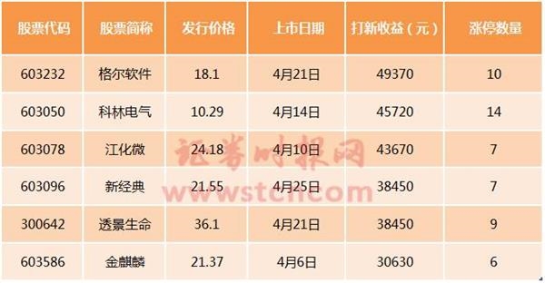 时报君统计了4月份以来上市后已经开板的新股,尚无一只新股中签收益突破5万元,超过3万元的也仅有6只,占4月份以来上市后开板的新股比例为15%左右,多集中在沪市。这也就意味着,近一段时间以来,约85%的新股中签收益都在3万元以下。