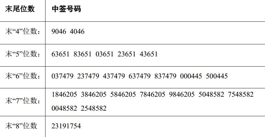 凡参与本次网上定价发行申购苏州晶瑞化学股份有限公司股票的投资者持有的申购配号尾数与上述号码相同的,则为中签号码。中签号码共有 39713 个,每个中签号码只能认购 500 股苏州晶瑞化学股份有限公司股票。