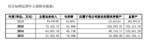 知网组团中核心的子公司同方知网——同方股份对其持股98.98%,在2016年营业收入为8.43亿元,同比增长13.63%,归属于母公司股东的净利润为1.76亿元。而同方知网2016年毛利率高达63.48%,但在最近4个会计年度里不断降低。