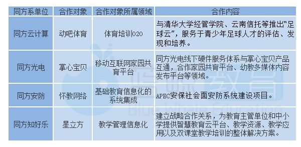 剥离了知好乐的同方系,在过去数年的经营中,旗下多个子公司与产业部门已与教育行业产生密切关联,例如与怀教网络合作的同方安防,与动吧体育合作的同方云计算,与掌心宝贝合作的同方光电,未来都可能是其发力教育的方向。