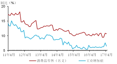 投资后续将如何?(1)周期面:设备更新周期将给后续以制造业投资提供“底”支撑。(2)资金面:金融去杠杆,提高金融体系对实体部门的融资服务效率,而非打压实体经济部门融资需求.4月固定资产到位资金和新开工项目计划总投资同比降幅收窄,预示后期投资不弱。(3)需求面:出口回落难掩外需复苏韧性,三四线地产外溢效应仍在,房地产库存较低且增加土地住宅供应以落实长效机制,地产投资仍将维持较高位。