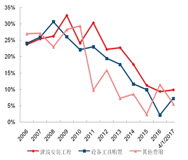 2009年“四万亿”大规模当中投资中的设备陆续进入折旧更新周期,而在微观层面,我们也看到了这样的迹象。设备更新周期的存量置换将给后续以制造业为代表的民间投资提供“底”支撑。2016年,建筑安装工程、设备工具购置增速分别为9.34%、2.13%。今年以来,二者的增速出现了改善回升的态势。