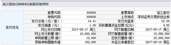 根据交易所公告,厦门延江新材料股份有限公司于2017年5月17日进行网上和网下申购。本次公开发行股票总数量为2,500万股。回拨机制启动前,网下初始发行数量为1,500万股,占本次发行总股数的60%;网上初始发行数量为1,000 万股,占本次发行总股数的40%。