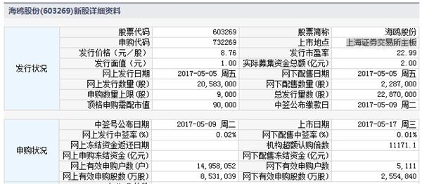 根据交易所公告,中孚信息股份有限公司于2017年5月17日进行网上和网下申购。本次发行股份数量为2,040万股,全部为新股,其中,网下初始发行数量为1,224万股,为本次发行数量的60%;网上初始发行数量为816万股,为本次发行数量的40%。