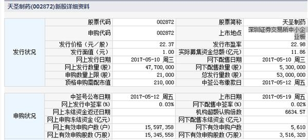 根据交易所公告,天圣制药集团股份有限公司于2017年5月19日起在深圳证券交易所中小企业板上市交易。