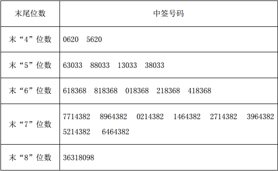 凡参与本次网上定价发行的投资者持有的申购配号尾数与上述号码相同的,则为中签号码。中签号码共有45000个,每个中签号码只能认购500股厦门延江新材料股份有限公司A股股票。