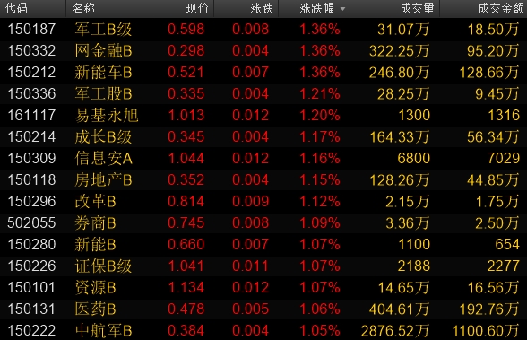 场内基金方面,军工主题基金逐步反弹。截至10:29,军工B级上涨1.36%,军工股B上涨1.21%,中航军B上涨1.05%,合计成交额超1100万元;同时受益于基础市场,保险B上涨2.30%,长盛证券B和证保B级涨逾1%,合计成交近15万元左右。