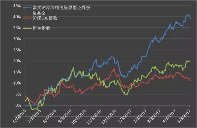 年迄今回报率最高的嘉实沪港深精选股票型证券投资基金(001878)自去年五月成立以来已取得了约40%的收益率,下图展示了这期间基金与恒生指数以及沪深300 指数的回报比较。从图中可以看出,该基金自去年10月中旬(成立后5个月)开始便赶超业绩比较基准(沪深300指数以及恒生指数),自17年1月起增长势头更是势不可挡。