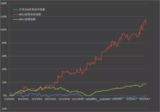 综合来看,该基金重仓在港交所上市的高科技公司,该类股票今年表现优异,下图比较了MSCI香港指数,MSCI香港信息技术指数以及沪深300信息技术指数的表现。香港科技股在内地受追捧一方面由于盈利能力高,并且和大陆的科技股相比较估值更合理。同样重仓在香港科技行业的中海沪港深价值基金(002214)也在这一波行情中取得了不错的收益率,其涨幅趋势基本与香港信息指数协同。