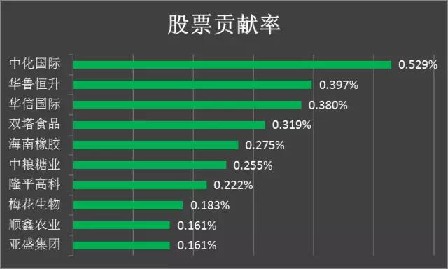 最后,若以去年最后一个季度基金的表现情况进行排名,第一的为前海开源沪港深农业主题精选灵活配置混合型证券投资基金(164403),但根据其披露的最新一期年报,该基金只有不到4%配置在港股,利用彭组合回报分析工具对回报率进行归因分析,发现大部分回报率来源也并非农业主题的股票,下图为16年最后一季度贡献度最高的10只股票。