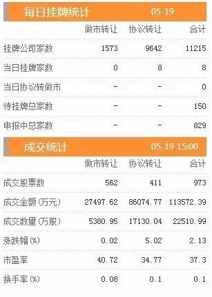 19日新增挂牌企业8家,挂牌企业总数达到11215家,做市转让1573家,协议转让9642家,待挂牌总家数150只,申报中总家数达到832家。