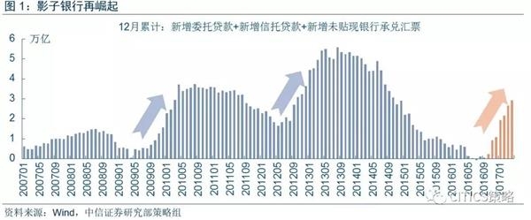 首先,我们在2017年年度策略《泡沫大迁移》中提示过,房地产调控限制开发商融资下,影子银行必然会再次崛起:旺盛的房地产开发融资需求难以通过标准化渠道满足,这与2009~2010年和2012~2013年两次上行没有太大差别。
