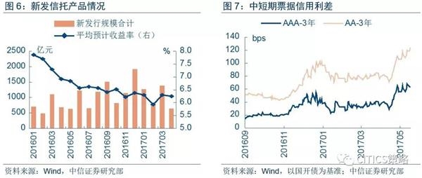 新发信用债利率继续上行,近期甚至出现了个别AA级信用债发行利率突破7%。但是,新发信托产品的预期收益率却没有出现明显上行,年化依然在6%~6.4%之间。信用趋紧的背景下,社会融资“供给侧”调整的结果,就是影子银行的再崛起,信用利差和终端利率上行。但不可忽视的是,金融监管则是抑制非标进一步增长的制度因素,2017年4月的新增非标资产规模明显回落。