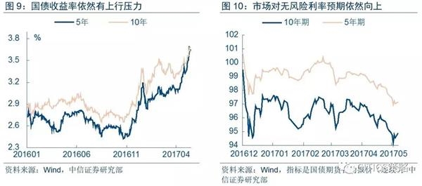 国内货币政策的基调保持稳健中性,而实体经济处于结构性去杠杆的过程中。央行5月12日在一季度货币政策执行报告中开始对市场进行安抚。与此同时,准政策利率受到的外部压力不小。虽然近期美国的就业和通胀数据没有显著优于预期,但5月的FOMC会议上依然释放出了比较明确的保持当前加息频率的信号。整体而言,根据数据测算,预计2017年全年美联储累计还将加息1~2次;而国内利率走廊的上下限也会受其影响,有调整压力。