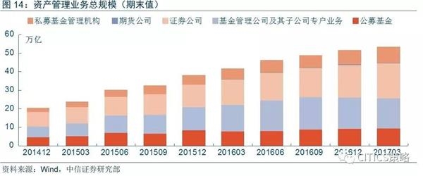 表内外资金关联日益紧密,也就意味着金融去杠杆很容易导致金融机构之间的流动性趋紧,并最终影响这些资金链接的终端资产,如债券和股票等。我们可以从资产管理业务总规模的扩张窥见趋势和潜在影响。但是,监管在实践的过程中,实际推进的节奏会随机应变,市场的预期和利率波动也会随之变化。