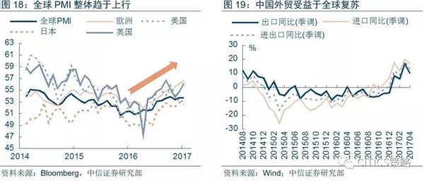 此外,全球主要的发达经济体的核心PMI也都在上升通道中,从美国、英国到欧洲,全球经济本轮复苏比较稳健。另外,人民币实际有效汇率指数也从2015年11月的高点下降了8%。这有利于改善中国的贸易条件,提升中国产品在本轮贸易复苏当中的竞争力。