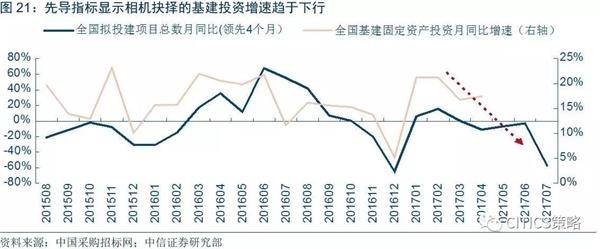 虽然基于中期周期的判断,需求方面房地产开发投资,外需和部分制造业投资向好,但我们判断主要受政策驱动的基建投资部分增速会从高位下行。如上图所示,我们从中国采购招标网抓取了“全国拟建项目总数”,历史数据显示,其同比增速领先基建投资增速4个月,而在2016年年底经济内生增长动力回升后,相机抉择的基建投资审批速度趋于下行:我们预计基建投资增速在2017年2季度及之后趋于下行,对应的增量融资需求也会减弱.