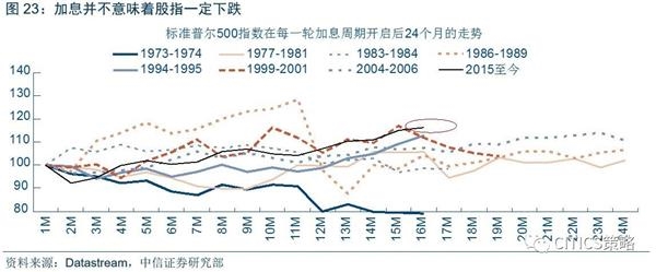 我们对下半年的核心判断是利率有持续上行压力。不过利率上行并不简单地意味着股票市场下行。中国的加息周期较少且A股指数扰动偏大,所以我们以美股历史上每一轮加息周期开启后标普500的走势为例来说明问题。历史上8轮加息周期,标普500指数在加息周期开启后24个月内涨幅在-21%到16%之间,其中只有2次加息周期指数出现下跌(1973-1974和1983-1984),其余6次都是上涨的。