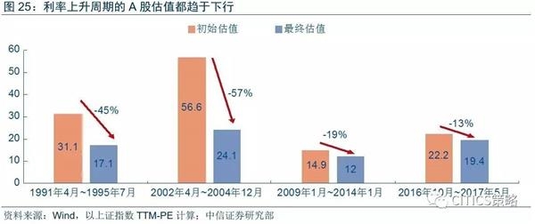 A股也是类似,除了2006-2007年的特殊情况(股改牛市),每一轮利率上升周期,A股整体的P/E估值都有-13%到-57%的下滑。