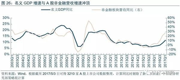 自上而下来看,国内宏观增速复苏是本轮A股非金融板块财务状况改善的基础。名义GDP增速与非金融板块营业收入增速走势有很强一致性。