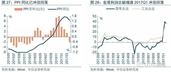 补库存力度趋缓,货币环境弱化,国内大宗商品期货价格从今年2月以来开始走弱,PPI同比走弱趋势比较明确。工业企业和国有企业的盈利增速也在2017年2月快速冲顶。假定2017年实际GDP增速整体稳定,但随着PPI同比在2017Q1冲顶回落,非金融板块营收的增速预计也在该季度见顶。我们认为,只要未来不出现类似2016年因为供给侧调整导致“控产保价”的困局,那么PPI同比将缓慢下行;但是如果供给侧调整因政策出现超预期收紧,那么不排除PPI同比在2017年年底再次冲顶.