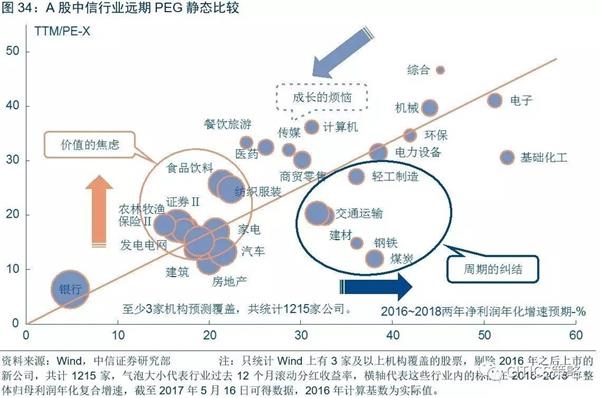 我们如果将盈利增速一致预期进一步拆分至中信一级行业,看其动态变化的话,可以发现A股板块行情明显的“三元分化”。我们同样选取了有3家及以上机构预测覆盖的1215家A股上市公司,其静态远期PEG分布如图43所示。自2017年以来,特别是4月市场出现明显调整以来,这张图的散点趋势并不是如以往一样简单地收敛于代表市场中枢的射线上,而是呈现三元分化的。一是“价值的焦虑”,市场“抱团”下,低估值和增长稳定的白马蓝筹股板块估值抬升,目前不少板块甚至略有高估。投资者,特别是机构投资者因为对这部分配置比较集中而“焦虑”于估值的冲顶回落。二是“周期的纠结”,虽然2017年周期类板块EPS预期上升是最明显的,但PPI同比冲顶的背景下,投资者“纠结”于是否可以持续参与,市场给予周期的估值相对其盈利改善幅度而言是不足的。三是“成长的烦恼”,TMT等板块从2016年开始就逐步从图中的右上角高位回落,估值和盈利均处于下行通道中。