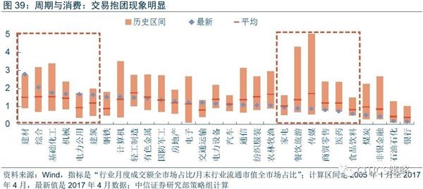 今年以来,确定性比较高的白马蓝筹和价值板块交易是比较拥挤的。从交易层面看,2017年A股两端“交易抱团”现象十分明显。周期板块虽有反复但交易活性很高,而消费板块抱团取暖和交易拥挤的现象比较明显。