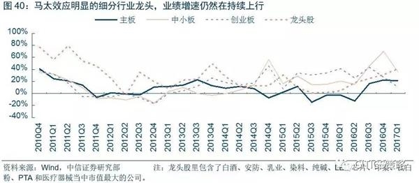 其次,分板块看,创业板和中小板盈利增速已经拐头向下:2017Q1中小板盈利增速降至34.0%,明显下行(其中包含了中小板周期股的影响);创业板降至11.2%(无论是否剔除温氏股份,都处于下行通道),主板增速虽然整体平稳,但进一步增长也比较乏力。