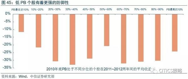 先来看绝对估值在利率上升环境下的作用。如果我们在2010年底把所有股票按照PB水平做10等分,那么PB最低的10%的股票下跌幅度明显要小于其他股票;而除了这部分绝对估值足够低的股票,其他股票的收益率与PB水平没有明显的相关性。
