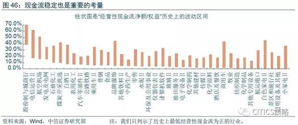 再来看现金流的作用。稳定现金流的行业和低估值理论上起到的作用是类似的,就是投资一只股票回收期更短,因此对于贴现率的变化也就不敏感。现金流最稳定的行业包括银行、电信运营、航空机场、电力及电网、石油化工、煤炭采选(例如中国神华)、白酒、农用化工(主要是化肥)、汽车零部件、公路铁路、乘用车、食品和品牌服饰.