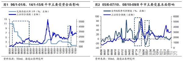 不同时期,影响市场的核心变量不同。但从艺术的角度来看,在不同阶段三个变量对市场的影响权重不同。以几次牛市为例,96/1-01/6、14/7-15/6的牛市主要受资金面驱动,这两个时期都是经济增长存在较大下行压力,央行连续降息降准以刺激经济增长,货币宽松推动的“水牛”行情。在96/1-01/6的牛市期间,1年期存款基准利率从10.98%持续回落至2.25%,下降了873个BP,但企业净利润增速从96年的5.8%降至01年的-16%。在14/7-15/6的牛市期间,央行4次降息、2次降准,但经济仍在回落,全部A股净利润增速从2014Q2的9.7%降至2015Q2的9.3%,ROE从13%降至11.6%。而05/6-07/10、08/10-09/8的两轮牛市主要受基本面驱动。05/6-07/10期间由于经济基本面非常强劲,央行连续7次上调基准利率抑制经济过热,但A股净利润增速仍然从05年中的-0.01%升至07年的62%。08/10-09/8期间“四万亿”刺激计划推动经济迅速反弹。13/1-14/2的创业板结构牛市,也主要受益于中小创企业盈利持续改善,中小板、创业板净利润增速分别从2012年的-10%、-8.8%提高到13年的5.9%、11%。为什么市场有时是资金面主导,有时又是基本面或风险偏好主导?主要因为在不同的市场阶段,资金面、基本面、风险偏好变化的剧烈程度不同,如14/7-15/6的牛市和15/6-16/1的熊市,资金面的剧烈波动引发了市场的涨跌,而经济基本面的变化相对平缓。