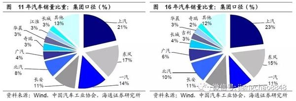 汽车行业集中度:14年见顶回落。从时间序列看,过去5年汽车制造业的行业集中度较为稳定,并呈“倒U”型,无论是CR2、CR4还是CR10,均在14年见顶,15、16年缓慢回落。CR2从14年的40.0%降至16年的38.4%,CR10则从14年的89.7%降至16年的88.3%。根据用途不同,汽车又可分为乘用车和商用车,16年前者销量占比87%。乘用车销量集中度同样呈“倒U”型,CR2从14年17.8%的高位降至16年的15.9%,而CR10则从14年的61.0%降至16年的56.7%.