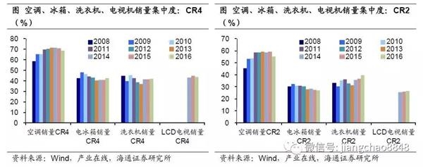 家电制造业子行业众多,我们选取空调、冰箱、洗衣机作为白电的代表,选取LCD电视作为黑电的代表,采用厂家销量数据,考察家电行业集中度。