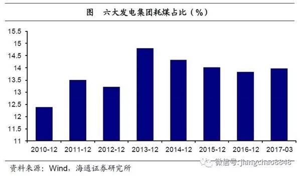 目前中国发电量仍主要来自火电,16年火电发电43958亿千瓦时,占总发电量的74%。因而我们可以从发电耗煤角度考察火电行业的集中度。六大发电集团(浙电、上电、粤电、国电、大唐、华能)发电耗煤占全行业比重(即CR6)在13年9月达到15%的高点,此后一路下滑,16年底降至13.8%,17年3月底略回升至14.0%,也高于16年同期的13.4%,但集中度回升的持续性仍待观察。