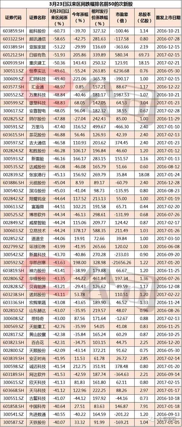 统计显示,在上市一年内的390只次新股中,3月23日以来区间涨幅为负的有267只,所占比例接近七成,其中跌幅超过30%的达到150只,占比接近四成。