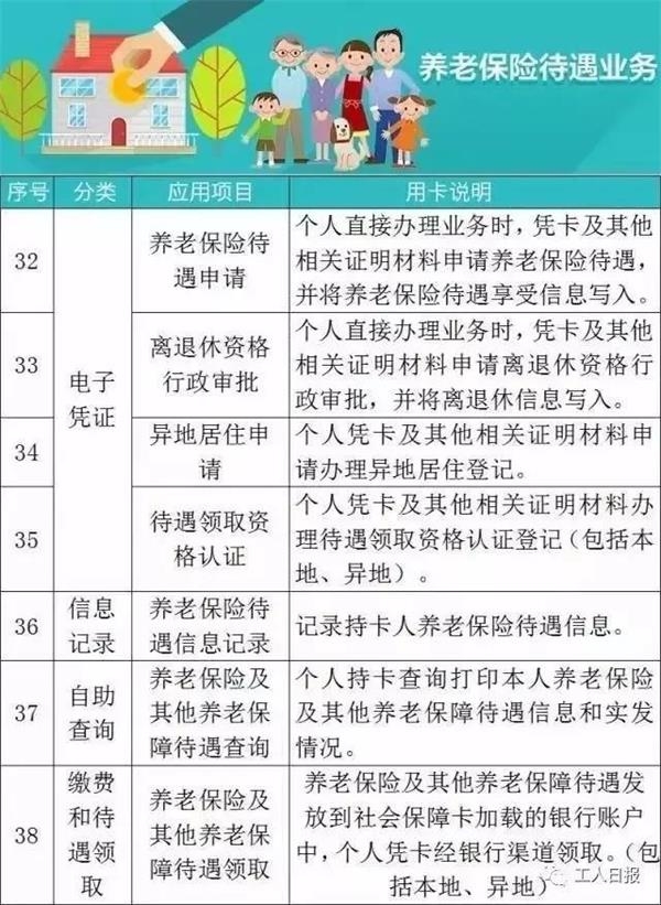 (五)缴费和待遇领取功能。通过社会保障卡的银行账户实现各类缴费和待遇领取。包括个人各项社会保险缴费、人事人才考试缴费,各项社会保险定期待遇和一次性待遇领取、报销费用领取、就业扶持政策补贴资金领取、重点行业(企业)农民工工资领取等。